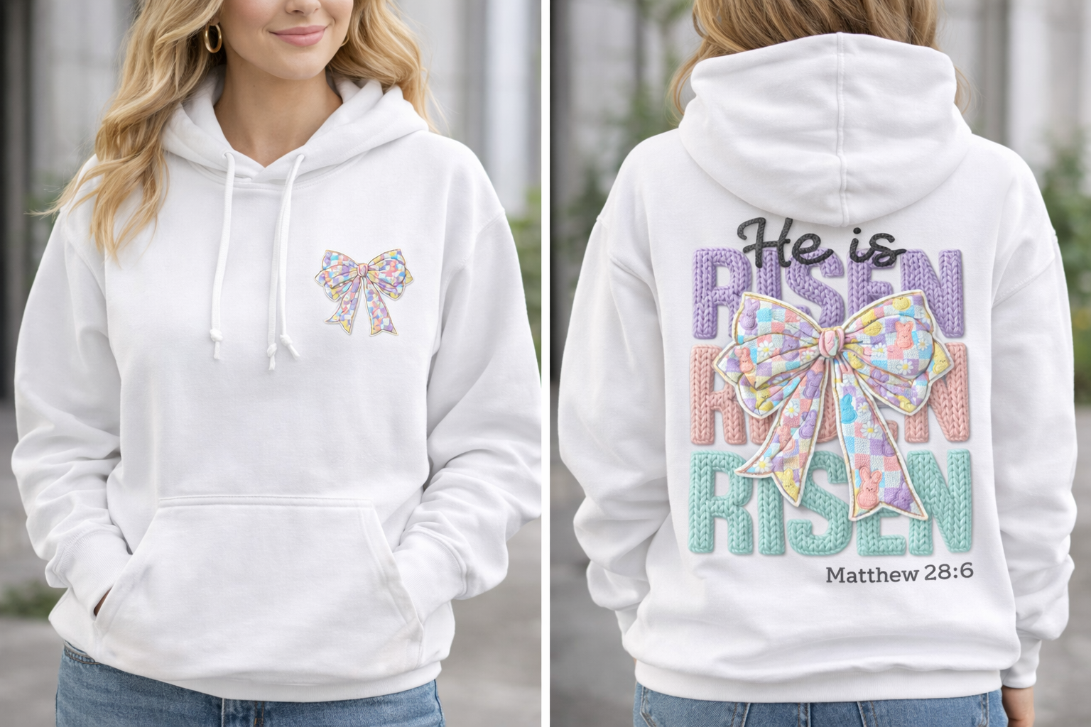 Finished with the coordinating Easter bow, this hoodie blends meaningful design with seasonal charm.